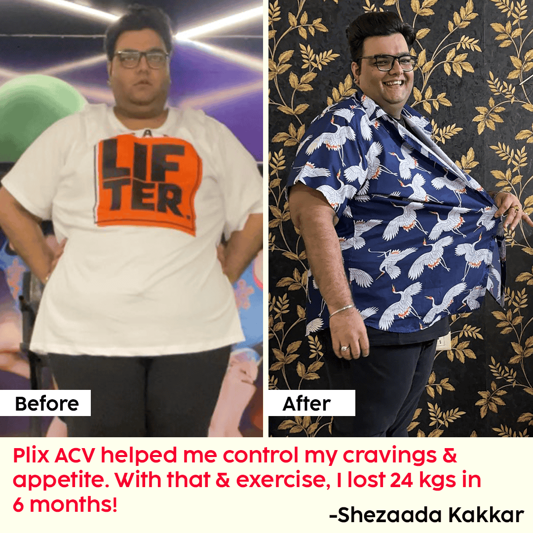 "I love an occasional burger. Plix ACV helps me in controlling these cravings & my appetite. Along with a tasty fix, I also get workout videos & a calorie deficit diet plan with recipes, which help me maintain my weight. Definitely worth the hype!"